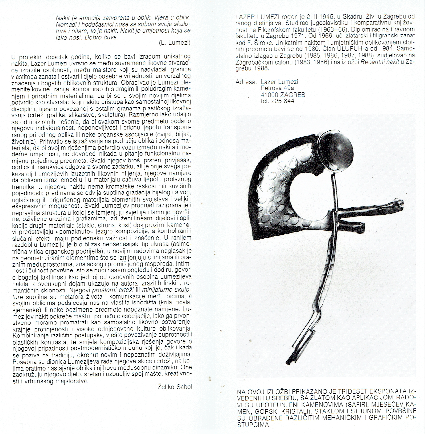 Lumezi je istaknuti umjetnik na području primijenjene umjetnosti i kiparstva malih formi, jedan od vodećih umjetnika u izradi umjetničkog nakita.